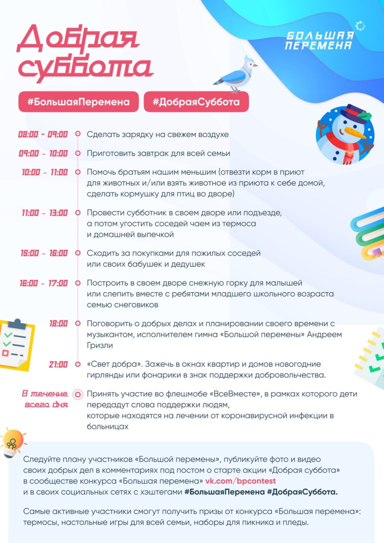 Акция «Добрая суббота» пройдет впервые 23 января 2021 года и предоставит возможности для самореализации ребят в среде волонтерства и социального проектирования. Акция станет традиционной и будет проводиться еженедельно в сообществе конкурса «Большая перемена».