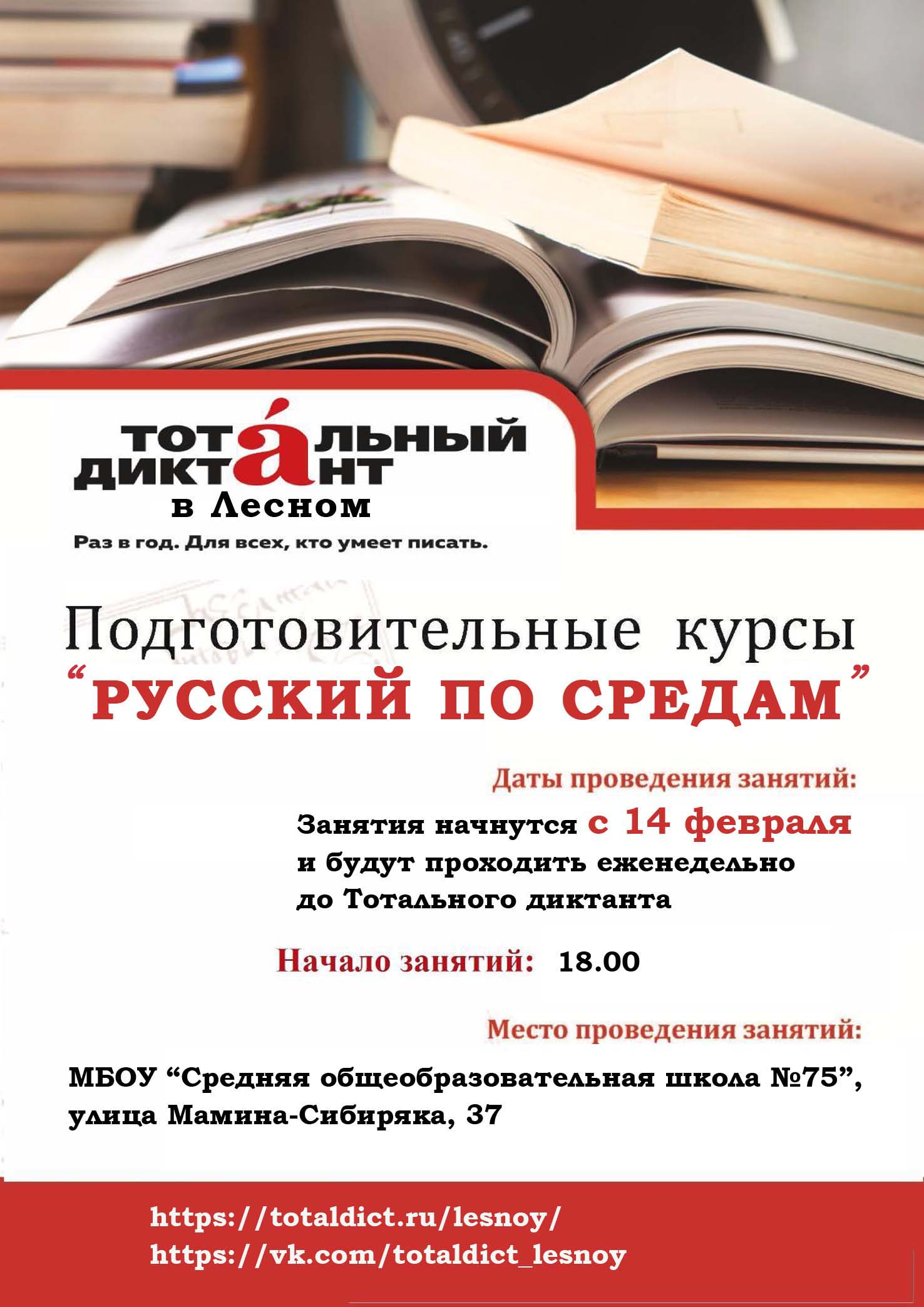 С 14 февраля в школе № 75 начнутся БЕСПЛАТНЫЕ курсы «РУССКИЙ ПО СРЕДАМ». Под руководством опытных педагогов-словесников любой желающий сможет вспомнить правила орфографии и пунктуации. Занятия будут проходить в форме мини-диктантов с последующим разбором ошибок и анализом грамматических и лексических трудностей. Специалисты уверены, что такая работа с «живым» текстом позволит комплексно подойти к повторению правил и увеличит шансы получить положительную оценку на «Тотальном диктанте».