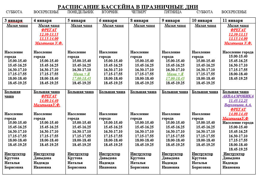 РАСПИСАНИЕ РАБОТЫ БАССЕЙНА В ПРАЗДНИЧНЫЕ ДНИ 2026 ГОДА!